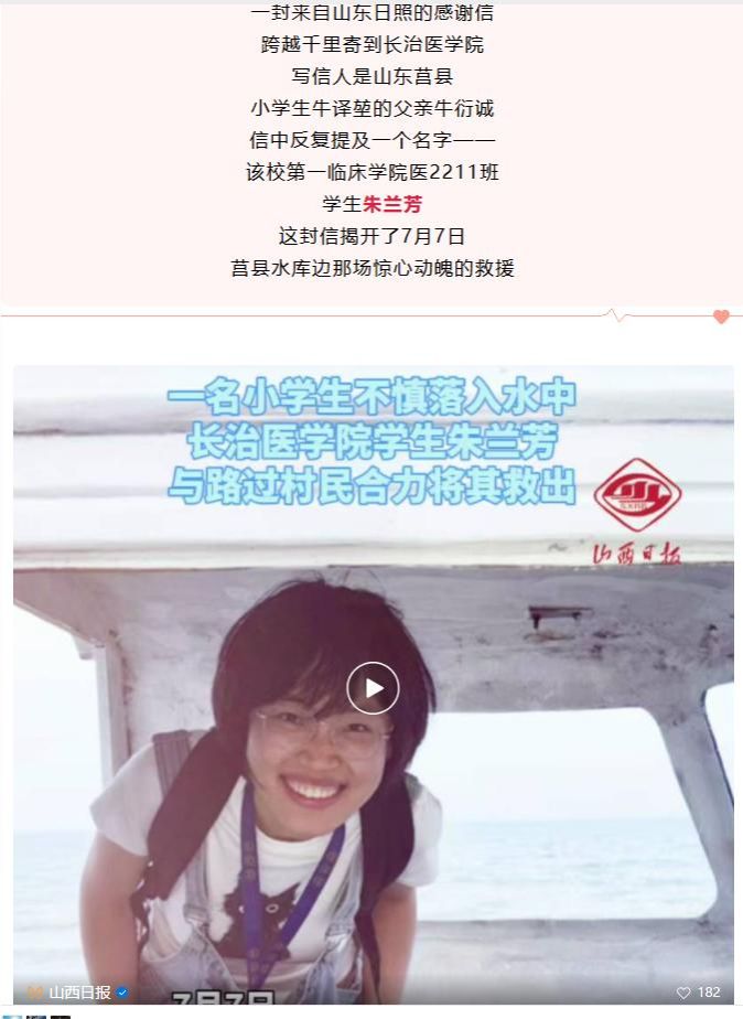 7月15日一封來自山東日照的感謝信跨越千里寄到長治醫(yī)學(xué)院寫信人是山東莒縣小學(xué)生牛譯堃的父親牛衍誠信中反復(fù)提及一個名字——該校第一臨床學(xué)院醫(yī)2211班學(xué)生朱蘭芳這封信揭開了7月7日莒縣水庫邊那場驚心動魄的救援7月7日傍晚,山東日照莒縣,小學(xué)生牛譯堃獨(dú)自在水庫邊刷鞋。因嫌近岸水渾濁,他走向深處尋找清水,卻一腳踏空滑入深水區(qū)。“我看見他喊著救命,在水里一沉一浮?!?2歲的牛吉亮正巧騎車載著孫女路過,聽到微弱呼救聲,急忙安置孫女后就甩掉鞋子跳進(jìn)水中。...