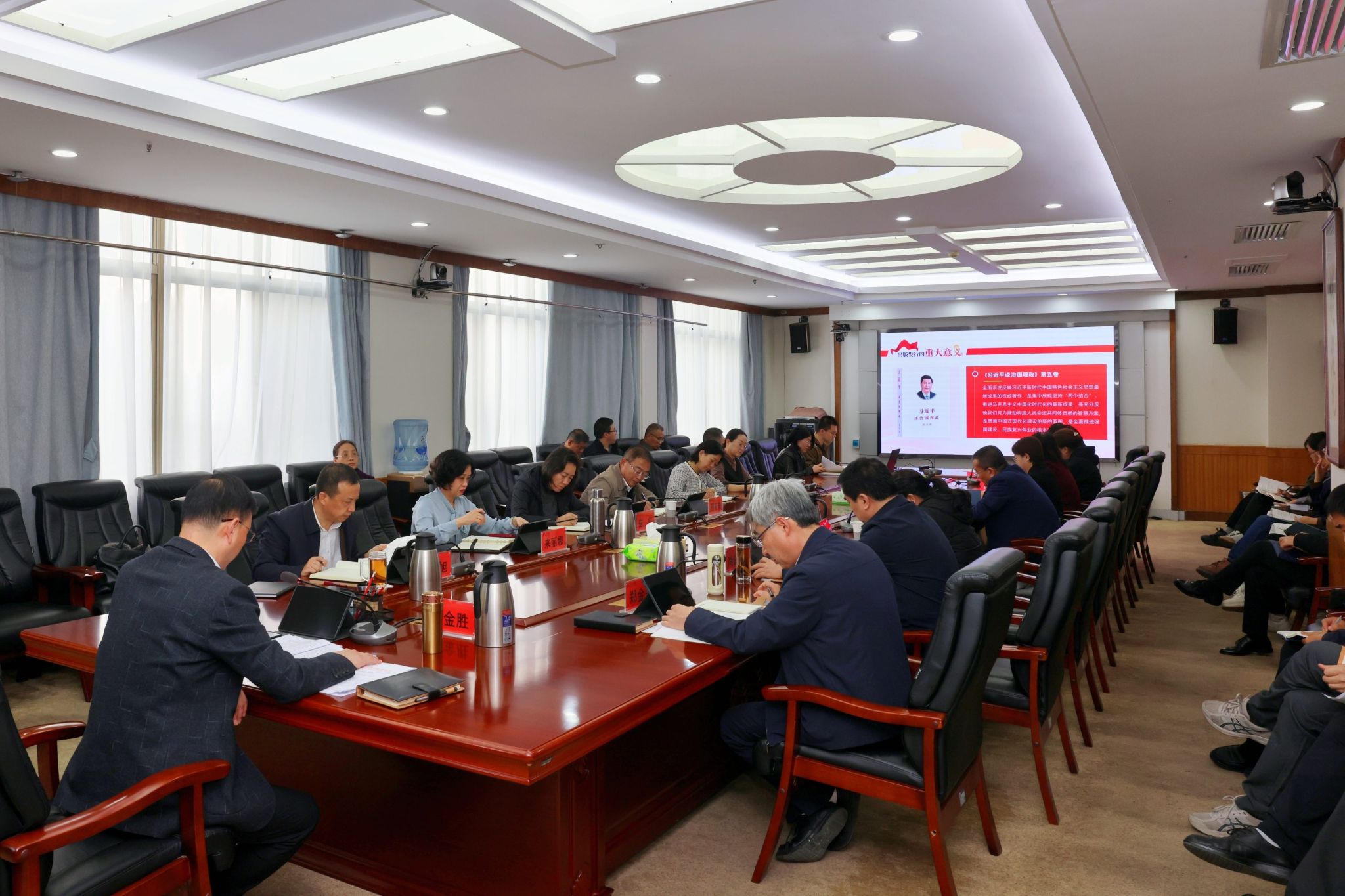 10月30日下午,我校召開黨委理論學(xué)習(xí)中心組學(xué)習(xí)會(huì),專題學(xué)習(xí)《習(xí)近平談治國理政》第五卷。學(xué)習(xí)會(huì)由黨委書記王金勝主持,中心組成員參加,黨(校)辦、各二級(jí)黨組織負(fù)責(zé)人及機(jī)關(guān)第一黨總支宣傳統(tǒng)戰(zhàn)黨支部全體黨員列席。本次學(xué)習(xí)會(huì)集中學(xué)習(xí)了《習(xí)近平談治國理政》第五卷第一至五專題,重點(diǎn)學(xué)習(xí)了培育和發(fā)展新質(zhì)生產(chǎn)力、一體推進(jìn)教育科技人才事業(yè)發(fā)展相關(guān)內(nèi)容。王金勝指出,《習(xí)近平談治國理政》第五卷是全面系統(tǒng)反映習(xí)近平新時(shí)代中國特色社會(huì)主義思想最新成果的權(quán)威著作,...