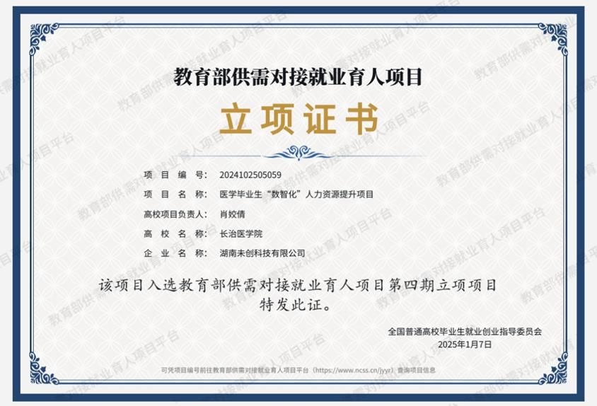 近日,我校肖姣倩老師團(tuán)隊與湖南省未創(chuàng)科技有限公司聯(lián)合申報的《醫(yī)學(xué)畢業(yè)生“數(shù)智化”人力資源提升項目》成功獲批立項,入選教育部第四期供需對接就業(yè)育人項目立項名單。這一成果既是對我校長期以來堅持就業(yè)導(dǎo)向、深化校企合作成效的認(rèn)可,也為學(xué)校探索產(chǎn)教融合新模式、構(gòu)建協(xié)同育人新生態(tài)提供了重要契機(jī)。供需對接就業(yè)育人項目由教育部高校學(xué)生司發(fā)起,旨在貫徹落實黨中央、國務(wù)院關(guān)于“穩(wěn)就業(yè)”“保就業(yè)”的決策部署,幫助用人單位培養(yǎng)和招聘更多實用型、...