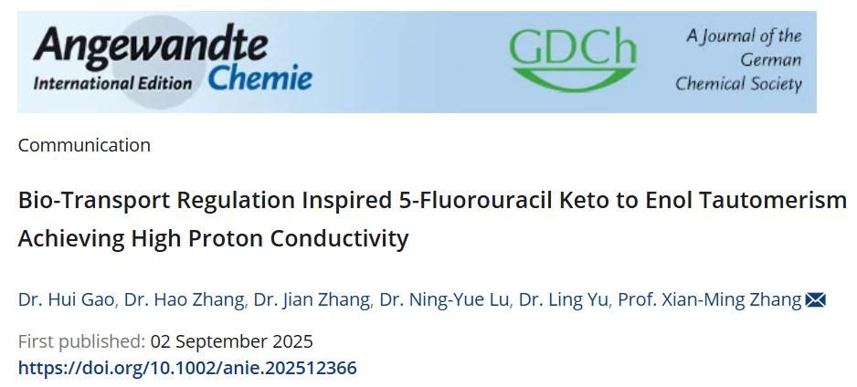 近日,我校藥學(xué)院高慧副教授以第一作者,長治醫(yī)學(xué)院為第一署名單位,在國際化學(xué)學(xué)術(shù)頂級期刊《Angewandte Chemie International Edition》(《德國應(yīng)用化學(xué)》)發(fā)表了題為“Bio-Transport Regulation Inspired 5-Fluorouracil Keto to Enol Tautomerism Achieving High Proton Conductivity”(Angew. Chem. Int. Ed. 2025, e202512366)的研究論文。