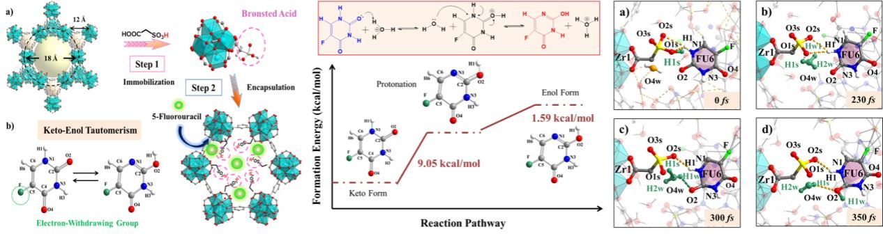 團隊聚焦于質(zhì)子導(dǎo)體材料中“高傳導(dǎo)率”與“通道穩(wěn)定性”難以協(xié)同的國際性難題,從細胞膜蛋白質(zhì)通道中的質(zhì)子傳輸機制獲得靈感,創(chuàng)新性地提出了一種“動態(tài)仿生調(diào)控”策略。該研究巧妙地將臨床常用的抗癌藥物5-氟尿嘧啶(5-FU)用作“分子開關(guān)”,利用其酮式-烯醇式互變異構(gòu)的特性,使材料內(nèi)部的氫鍵網(wǎng)絡(luò)實現(xiàn)智能重構(gòu),最終建成了一條既穩(wěn)定又高效的雙路徑質(zhì)子傳輸通道,實現(xiàn)了質(zhì)子傳輸和遷移能壘的精確控制。