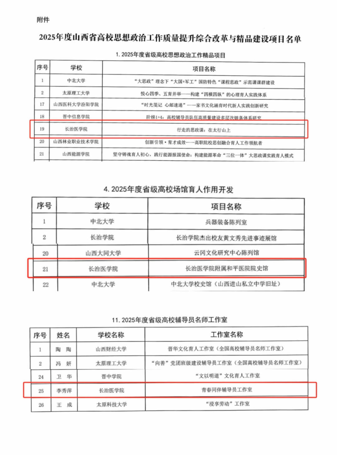 近日,山西省教育廳公布了2025年度山西省高校思想政治工作質(zhì)量提升綜合改革與精品建設(shè)項目名單,我校馬克思主義學(xué)院申報的實踐育人項目“行走的思政課:在太行山上”和場館育人作用開發(fā)項目“長治醫(yī)學(xué)院附屬和平醫(yī)院院史館”獲得立項;黨委學(xué)生工作部“青春同伴”輔導(dǎo)員工作室獲批省級輔導(dǎo)員名師工作室。