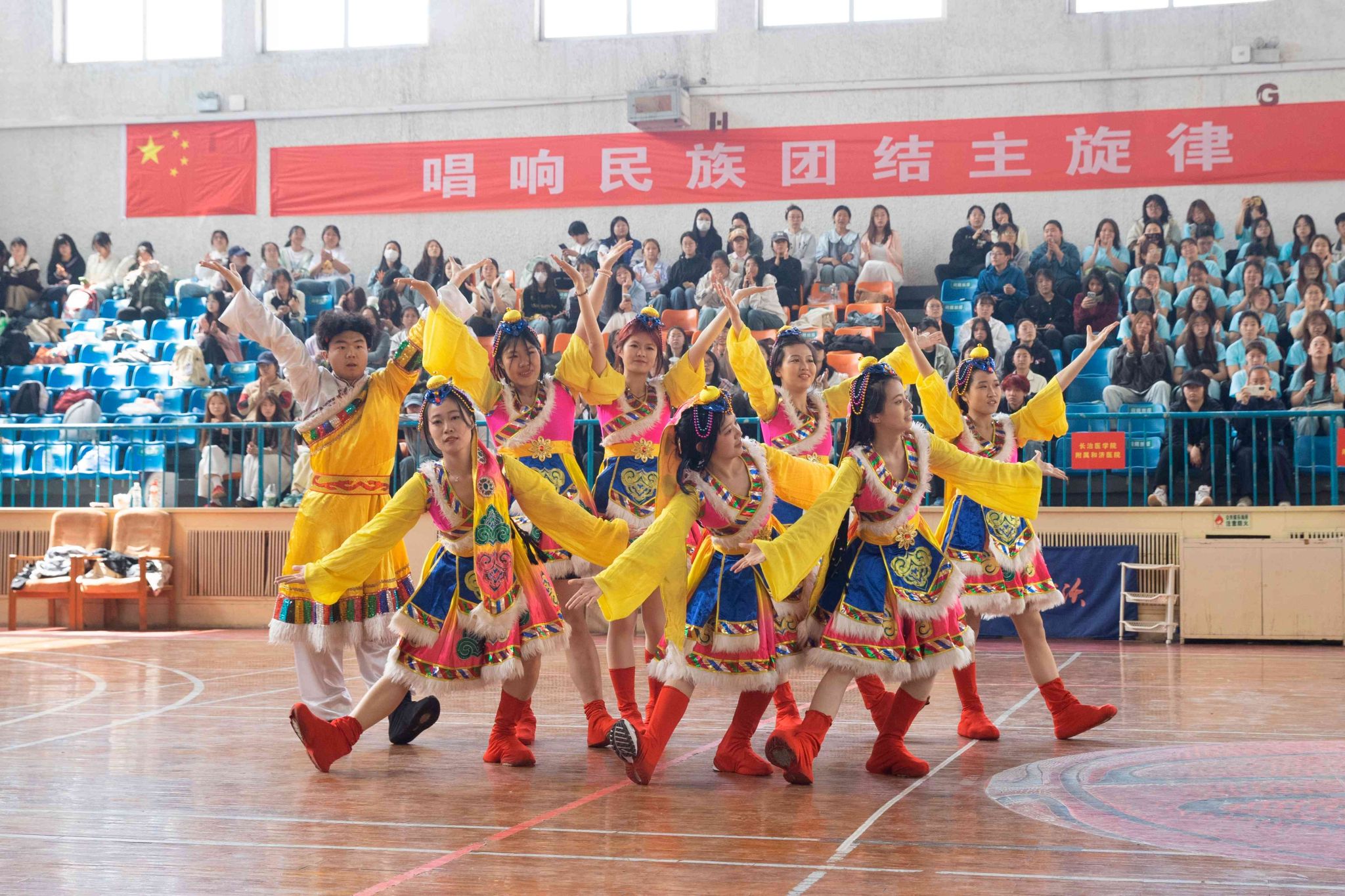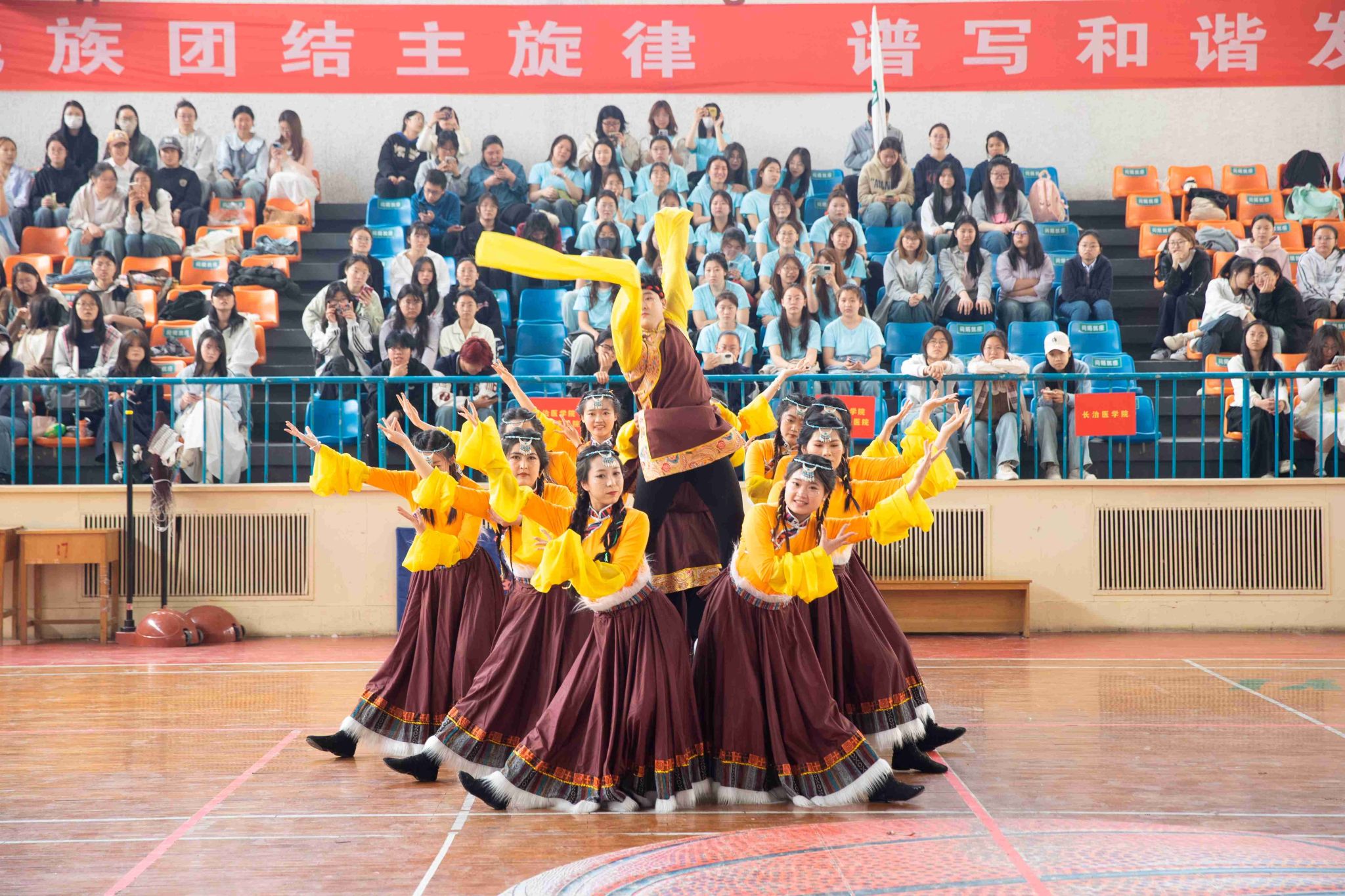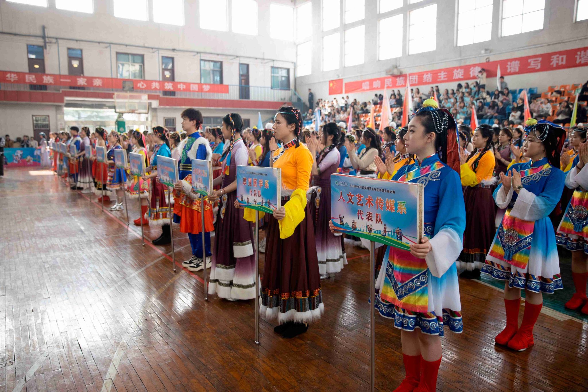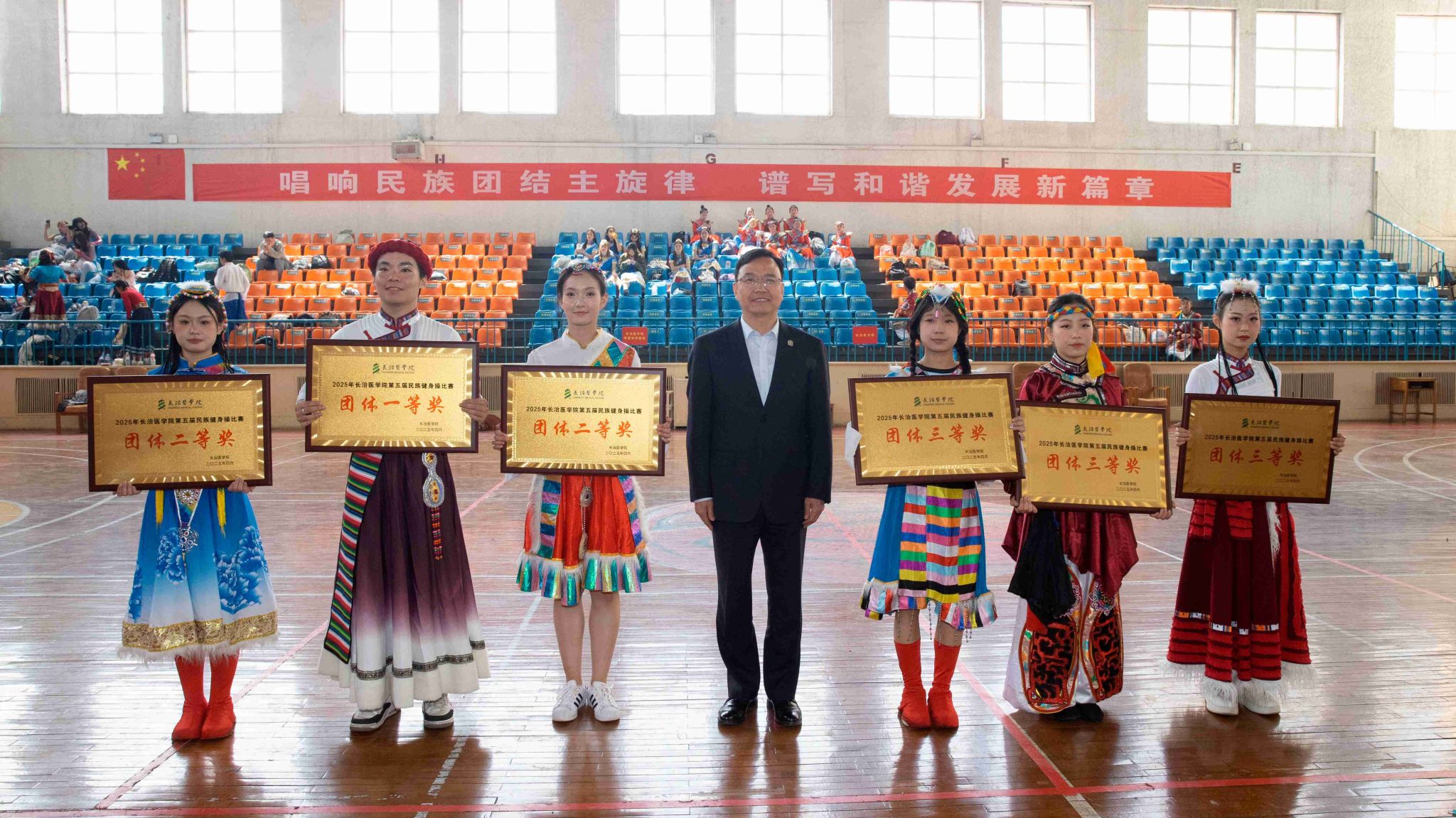 民族健身操是我校民族團結(jié)進步創(chuàng)建工作的生動載體,為深入貫徹落實習(xí)近平總書記關(guān)于加強和改進民族工作的重要思想,以鑄牢中華民族共同體意識為主線,增進各民族學(xué)生交往交流交融,生動展現(xiàn)當代大學(xué)生團結(jié)奮進、朝氣蓬勃的精神風貌,4月19日,由黨委統(tǒng)戰(zhàn)部主辦、公共體育教學(xué)部承辦的長治醫(yī)學(xué)院第五屆民族健身操大賽在文體中心開賽。來自全校17個院系的26支參賽隊伍以民族健身操為媒,將多彩民族文化融入動感韻律之中,為師生帶來一場民族文化與運動之美交相輝映的視聽盛宴。校黨委書記王金勝,長治市委統(tǒng)戰(zhàn)部副部長、民宗局局長趙百勝,長治市委統(tǒng)戰(zhàn)部民宗科科長張勇蒞臨活動現(xiàn)場,共同見證各民族青年學(xué)子在體育競技中增進團結(jié)、深化交流的精彩時刻。