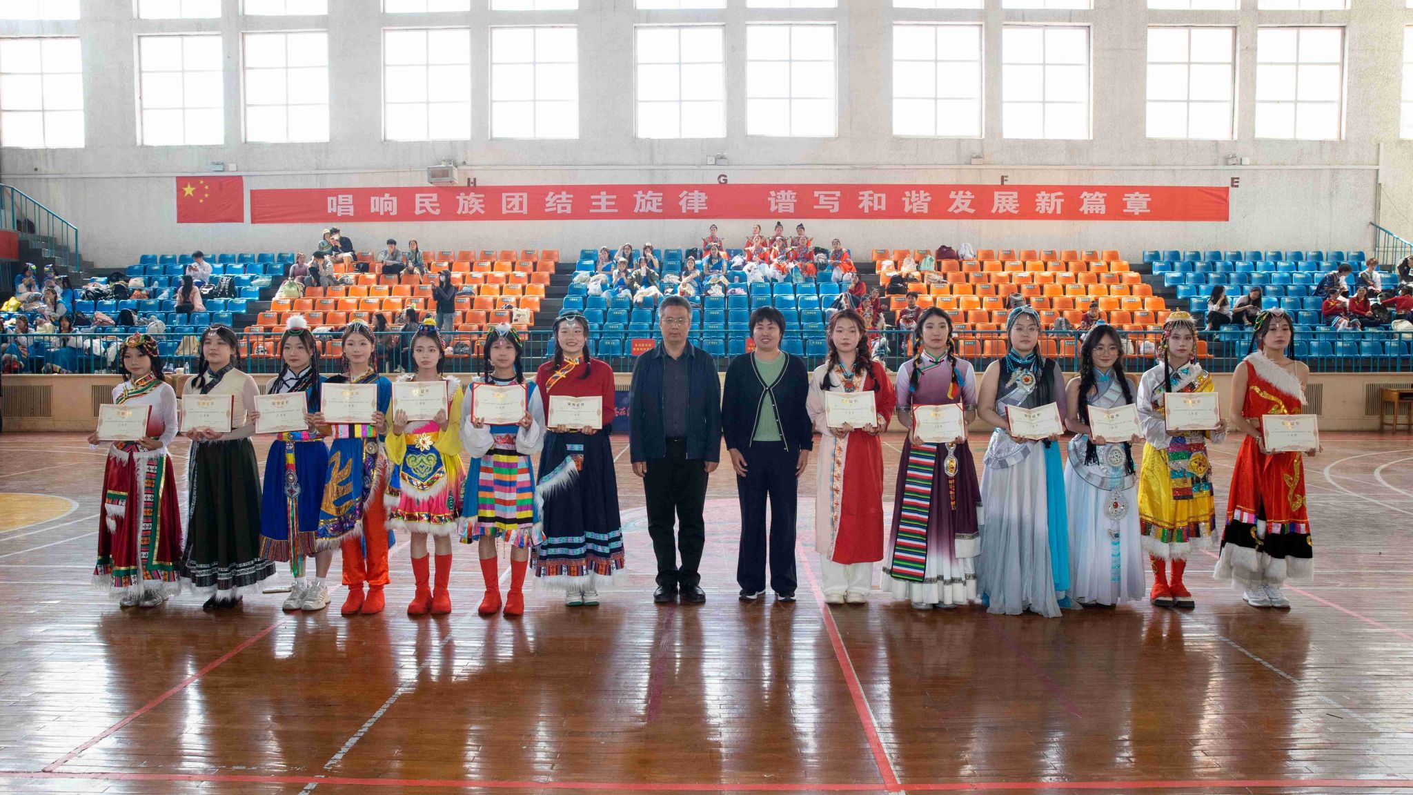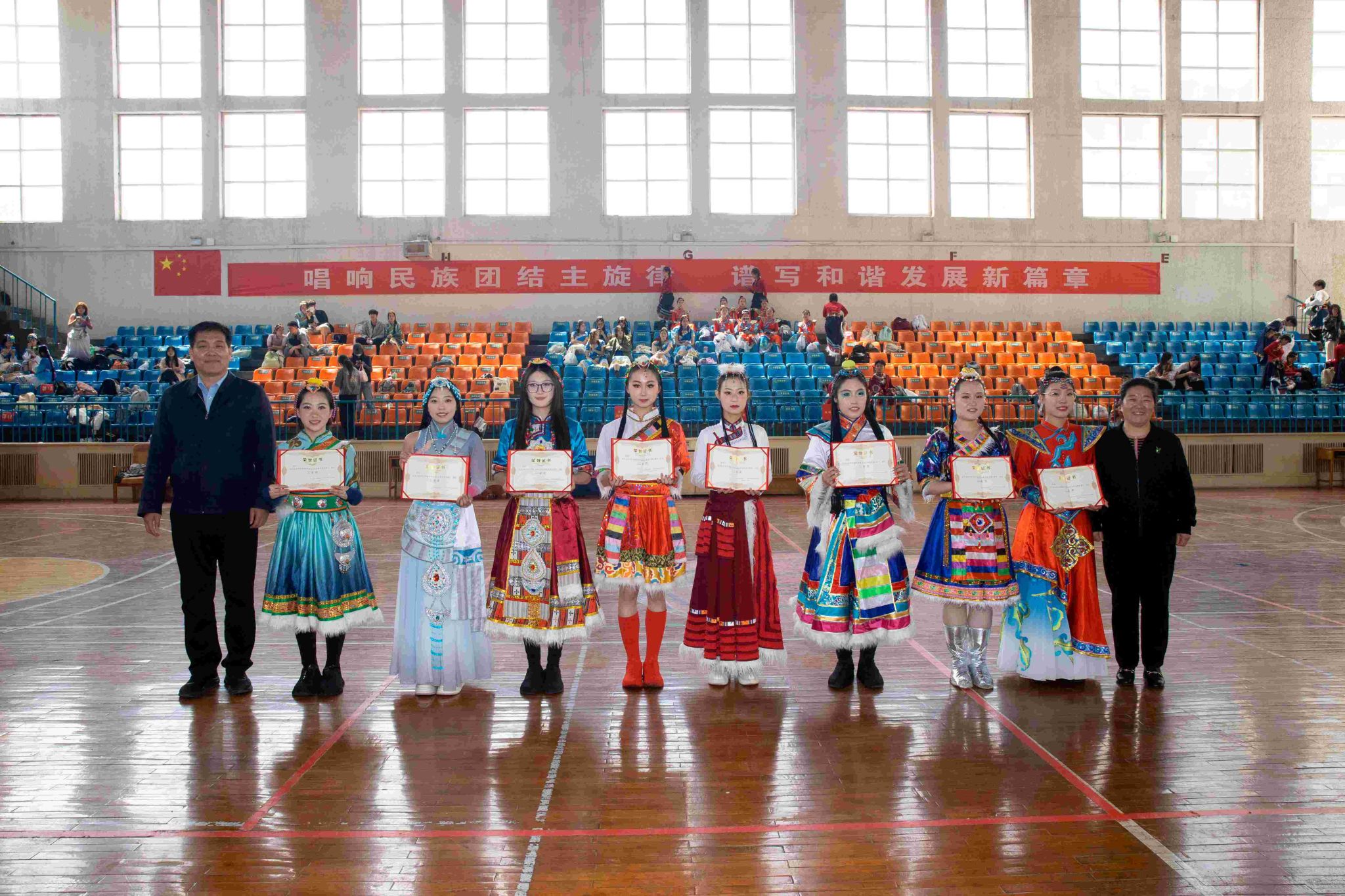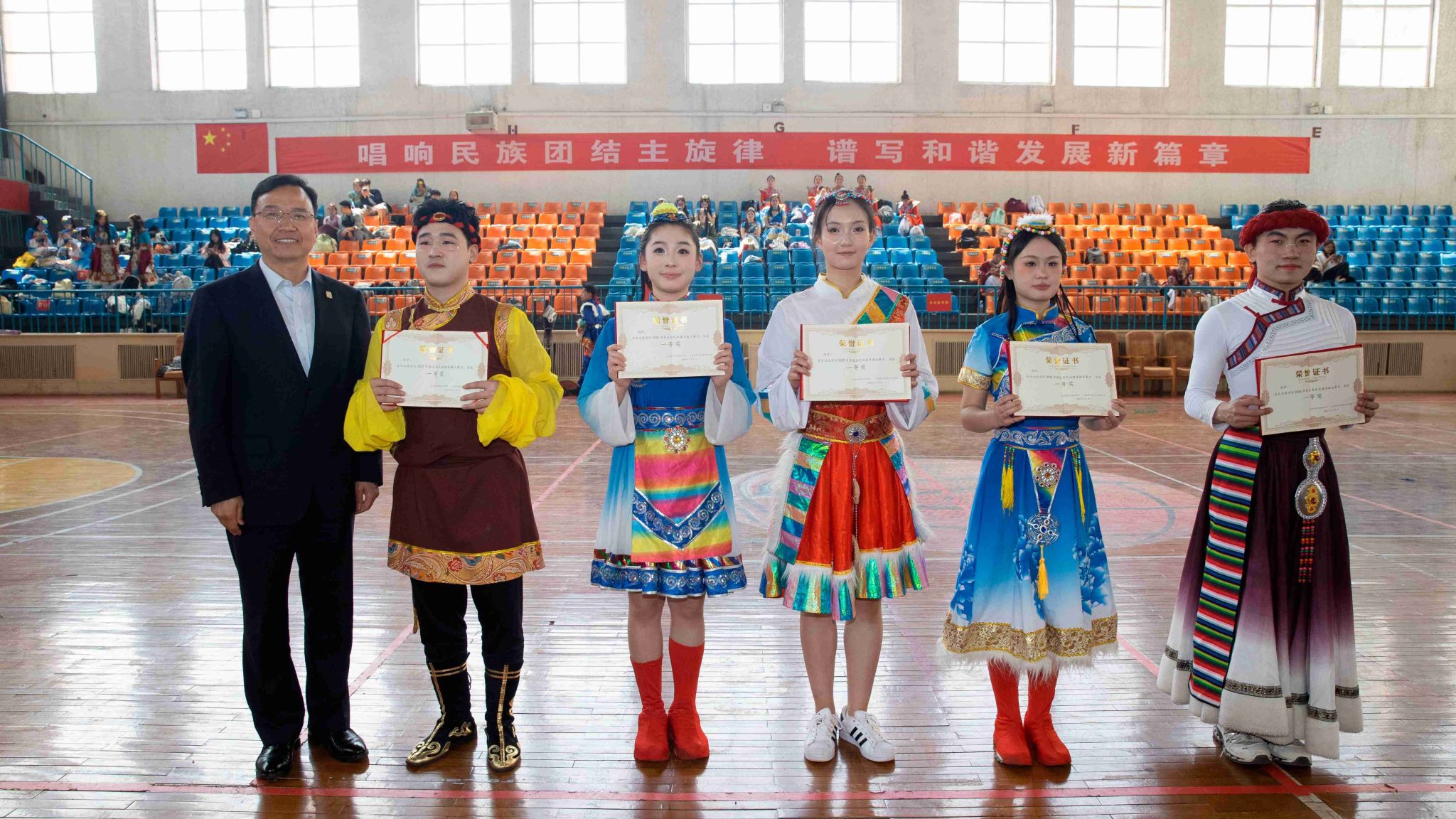 閉幕式上,王金勝代表學(xué)校黨委向在大賽中取得優(yōu)異成績的參賽隊伍表示熱烈祝賀。他指出,本次大賽將民族傳統(tǒng)文化與現(xiàn)代體育美育理念深度融合,不僅是一場技藝比拼,更是一堂生動的思政課。參賽選手以舞蹈為媒介增進理解,以協(xié)作精神促進融合,不僅詮釋了“美美與共,天下大同”的深刻內(nèi)涵,同時也讓 “三個離不開”思想深深扎根心間,讓“五個認同”在青春的碰撞中愈發(fā)堅定,充分體現(xiàn)了新時代青年“請黨放心,強國有我”的青春擔當。他寄語同學(xué)們,要將賽場上的團結(jié)精神轉(zhuǎn)化為奮進力量,做中華優(yōu)秀傳統(tǒng)文化的傳承者、創(chuàng)新者和傳播者,努力成長為德才兼?zhèn)洹⑷姘l(fā)展的社會主義建設(shè)者和接班人,為實現(xiàn)中華民族偉大復(fù)興貢獻青春力量。