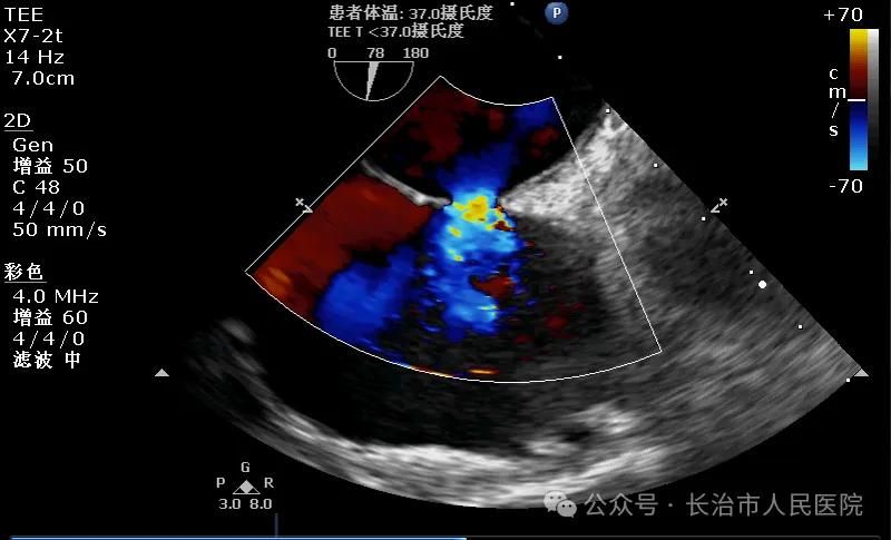 手術(shù)在全麻下進(jìn)行,在食道超聲的全程引導(dǎo)下,醫(yī)生順利完成了對缺損房間隔的介入封堵。整個手術(shù)持續(xù)約 1 小時,術(shù)后患者無不適,血壓平穩(wěn)。經(jīng)食道超聲及經(jīng)胸超聲檢查,均提示封堵良好,患者已安返病房。
