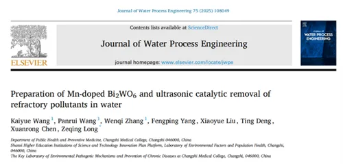 近日,公共衛(wèi)生與預(yù)防醫(yī)學(xué)系2021級3班本科生王凱鑰以第一作者身份在國際知名期刊《Journal of Water Process Engineering》(影響因子IF2025=6.315,JCR Q1區(qū))發(fā)表題為《Preparation of Mn-doped Bi2WO6 and ultrasonic catalytic removal of refractory pollutants in water》的學(xué)術(shù)論文。公共衛(wèi)生與預(yù)防醫(yī)學(xué)系2021級3班本科生王盼銳、張文琦為該論文的共同第一作者,龍澤清副教授為唯一通訊作者。