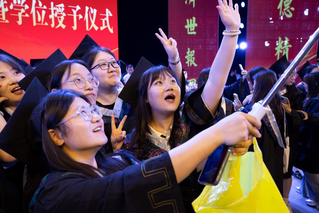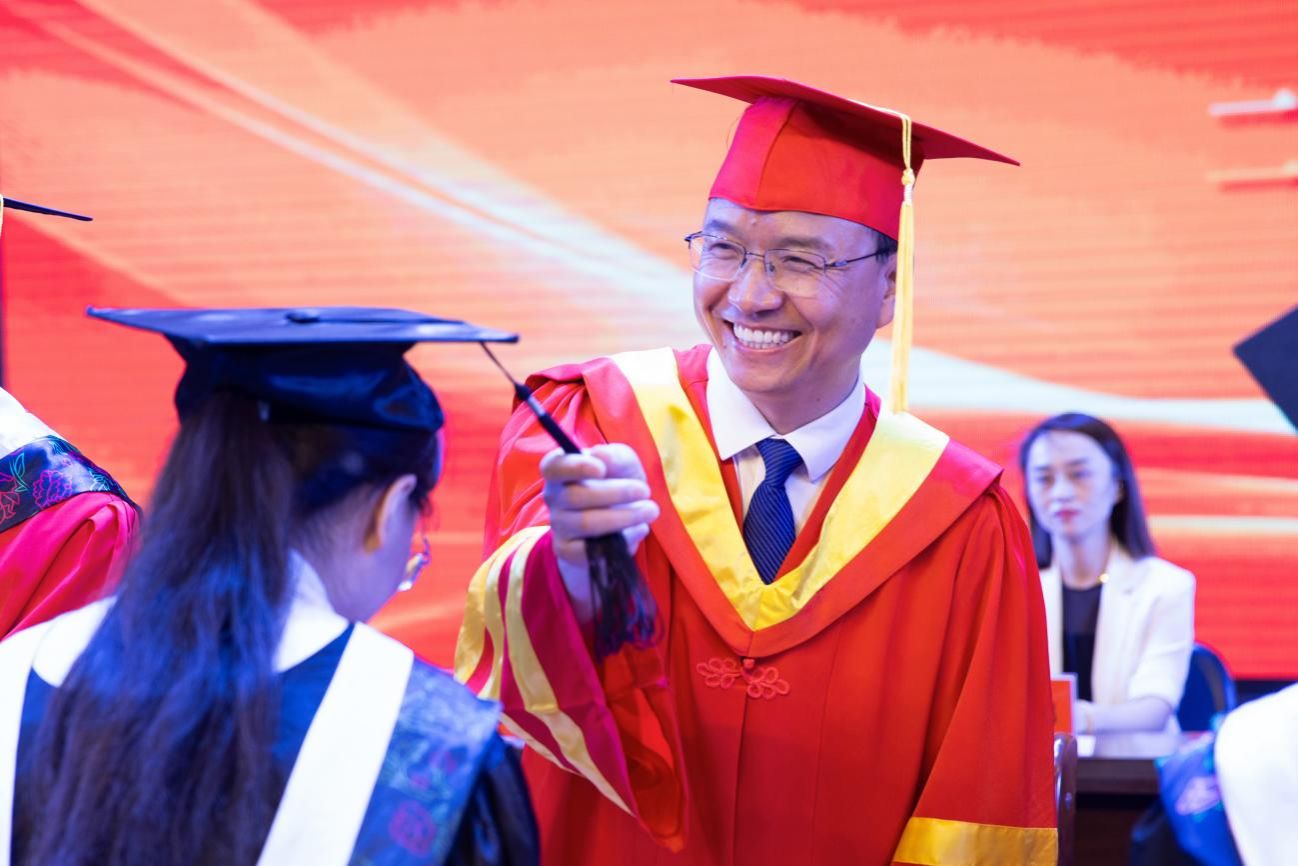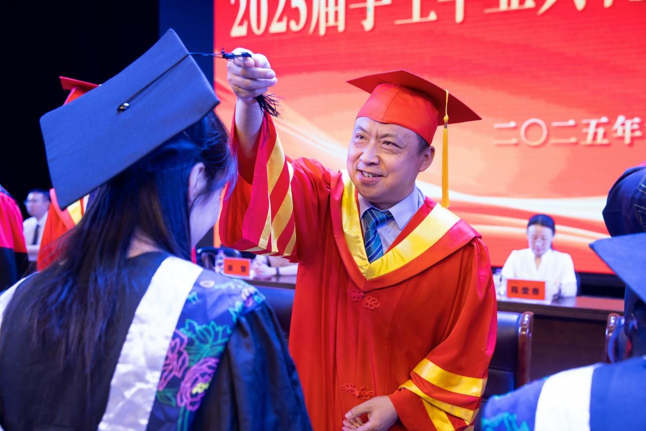 校領(lǐng)導(dǎo)及前排就座的校學位評定委員會委員為畢業(yè)生撥穗正冠,頒發(fā)學位證書。