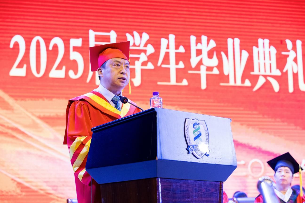 校黨委副書記、校長王旭以《披荊斬棘,一路生花,在奮斗中創(chuàng)造精彩人生》為題,為即將告別校園的2025屆畢業(yè)生上了“最后一課”。他深情寄語2025屆全體畢業(yè)生要將小我融入大我,在世界百年未有之大變局中以青春之歌書寫“強國有我”的使命擔當;要用情懷駕馭技術(shù),在人工智能重塑醫(yī)療生態(tài)的時代浪潮中以仁心仁術(shù)守護人民健康;要用自信引領(lǐng)人生,在服務(wù)健康中國的大局中以經(jīng)世致用傳承精神品質(zhì)。希望同學們風雨兼程、乘風破浪,披荊斬棘、一路生花,在逆境中看到希望、不輕言棄,在順境中學會感恩、不驕不躁。