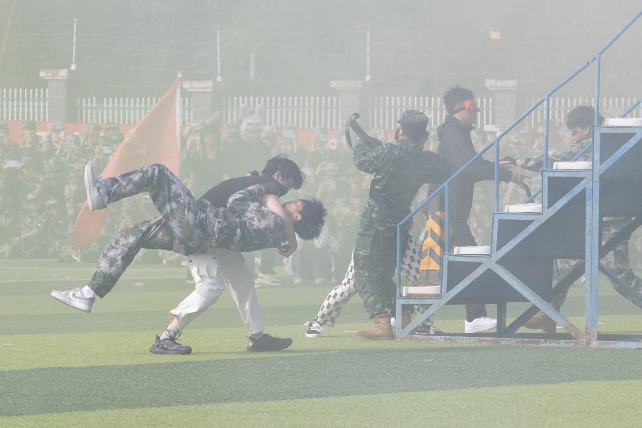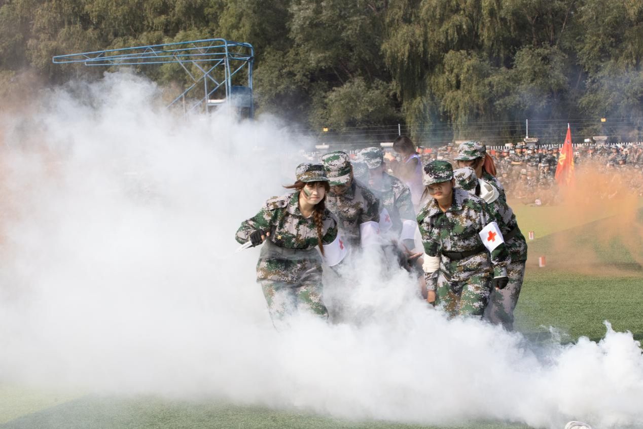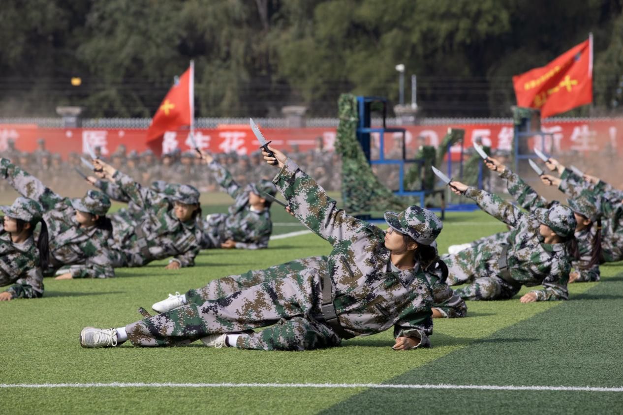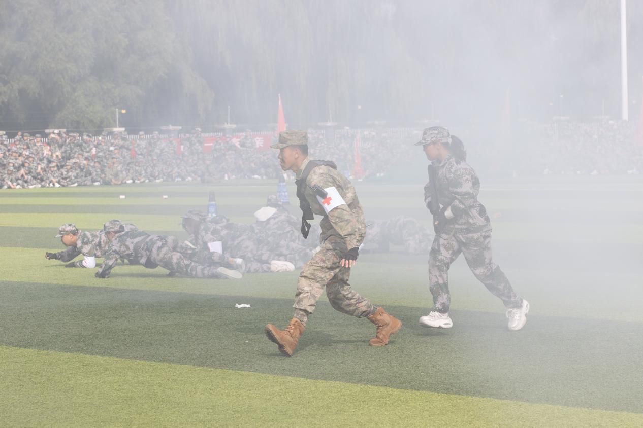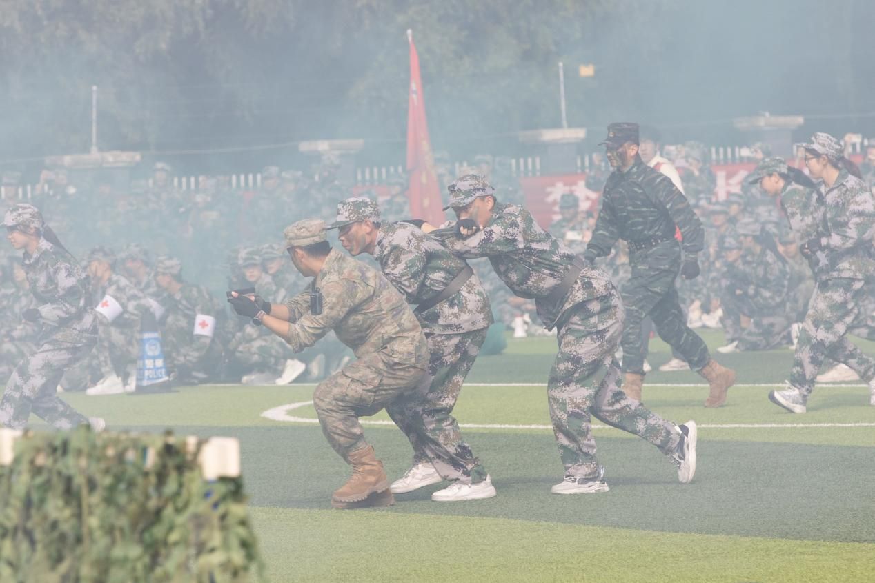 隨后,2025級新生以連隊為單位進行了分列式匯報表演。22個連隊步伐整齊、口號嘹亮、精神飽滿,展現(xiàn)出良好的軍事素養(yǎng)和昂揚斗志。緊接著,學(xué)生方隊依次進行了擒敵拳、匕首操表演,動作剛勁有力、連貫嫻熟;退役大學(xué)生教官進行了隊列動作示范表演,展現(xiàn)出過硬的軍事作風(fēng);教官與學(xué)生聯(lián)合開展的戰(zhàn)地救援演練,模擬實戰(zhàn)環(huán)境,流程專業(yè)有序,體現(xiàn)了我校醫(yī)學(xué)特色與軍事訓(xùn)練的深度融合。