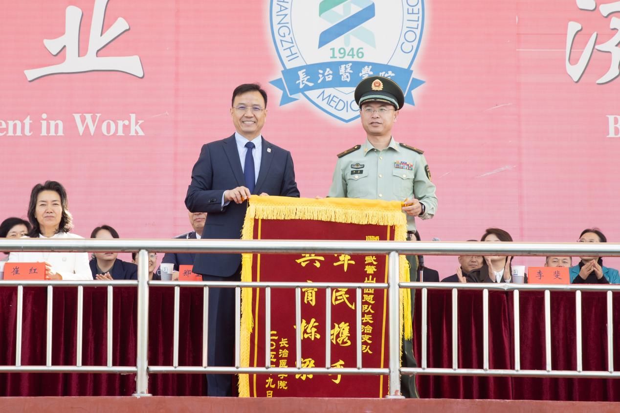 王金勝代表學(xué)校向武警山西總隊長治支隊贈送錦旗,表達對承訓(xùn)單位辛勤付出的衷心感謝。