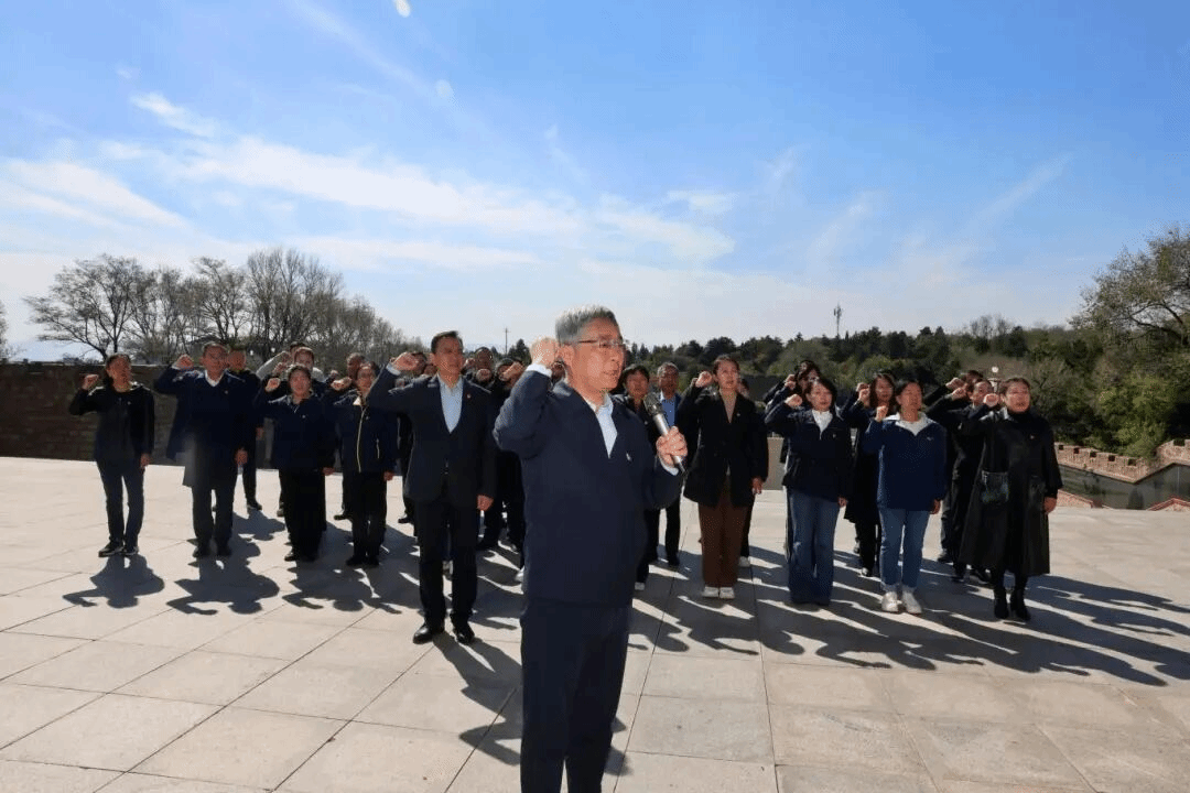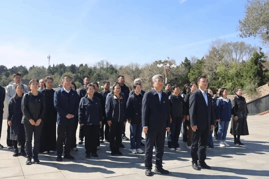 在松柏環(huán)繞的百團大戰(zhàn)紀念碑上,“戰(zhàn)績輝煌永垂史冊” 的鎏金大字熠熠生輝。全體人員整齊列隊,在莊嚴肅穆的氛圍中奏唱《義勇軍進行曲》,禮兵緩步上前敬獻花籃,黨委書記王金勝神情凝重地整理緞帶,全體人員向紀念碑三鞠躬表達深切緬懷。