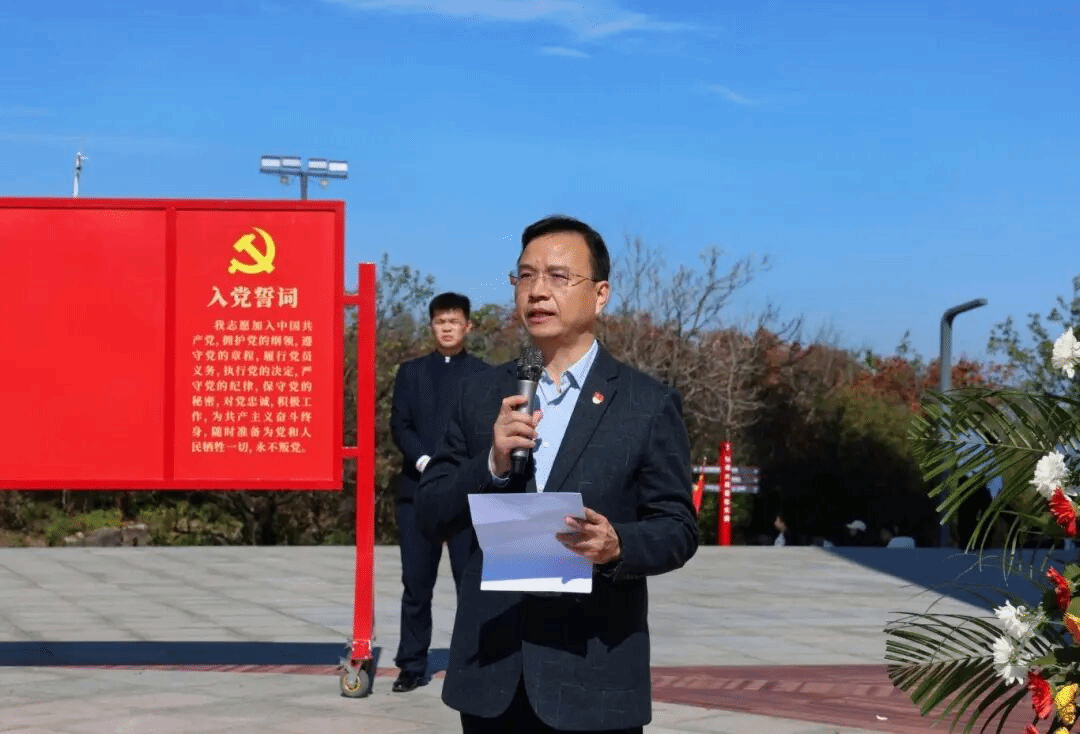 隨后,全體黨員面向黨旗重溫入黨誓詞,黨委副書記鄭金平領誓,鏗鏘誓言回蕩在獅腦山巔。