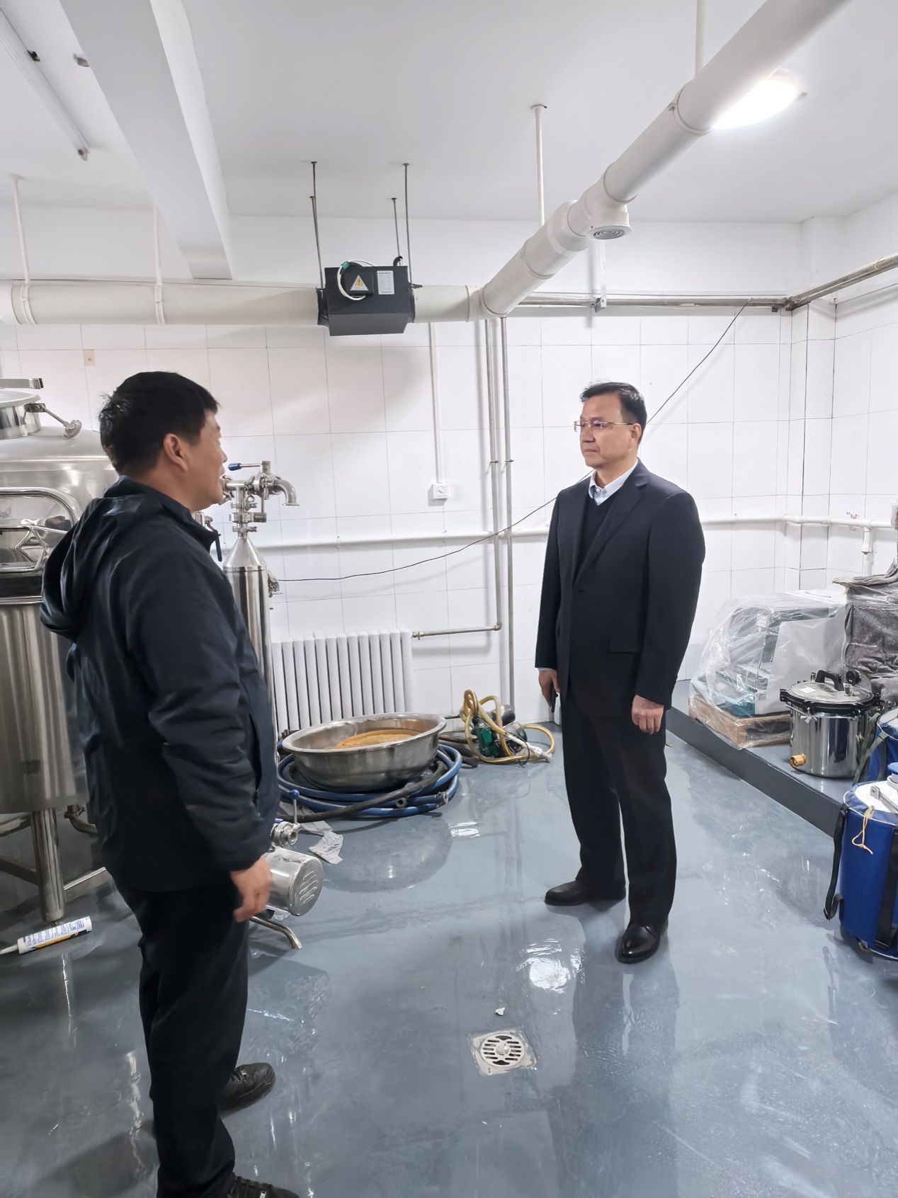 王金勝指出,“糧—菇”輪作是我校將論文寫在大地上、把成果送進(jìn)千萬家的具體體現(xiàn),是學(xué)校積極服務(wù)國家鄉(xiāng)村振興戰(zhàn)略、推動(dòng)科技與產(chǎn)業(yè)深度融合的典范。他強(qiáng)調(diào),科技管理部門要進(jìn)一步強(qiáng)化項(xiàng)目全過程管理與服務(wù),聚焦于技術(shù)落地、成果轉(zhuǎn)化和模式推廣等重點(diǎn)環(huán)節(jié),構(gòu)建“產(chǎn)學(xué)研用”一體化推進(jìn)機(jī)制,持續(xù)激發(fā)科技創(chuàng)新的內(nèi)生動(dòng)力。在五龍校區(qū)藥食同源產(chǎn)品開發(fā)實(shí)驗(yàn)室,王金勝與段國鋒進(jìn)一步交流了產(chǎn)品深度開發(fā)的相關(guān)事宜。