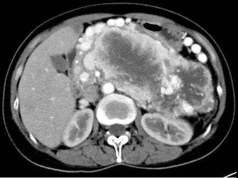 術(shù)前CT顯示患者腫瘤巨大,與脾臟、胰腺、胃、腎上腺、結(jié)腸界限不清,并且腫瘤合并局限性門靜脈高壓癥,被曲張的血管包繞,手術(shù)難度極高,風(fēng)險較大,腫瘤切除過程中稍有偏差就會損傷密布叢生的血管,很可能發(fā)生術(shù)中致命性大出血。