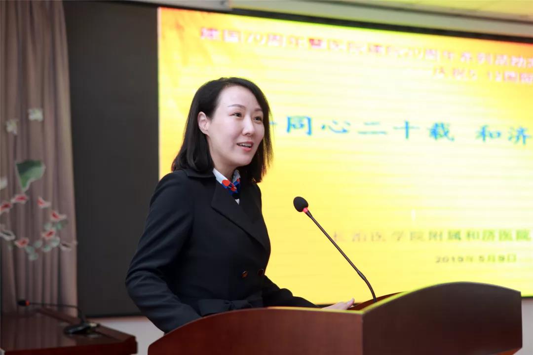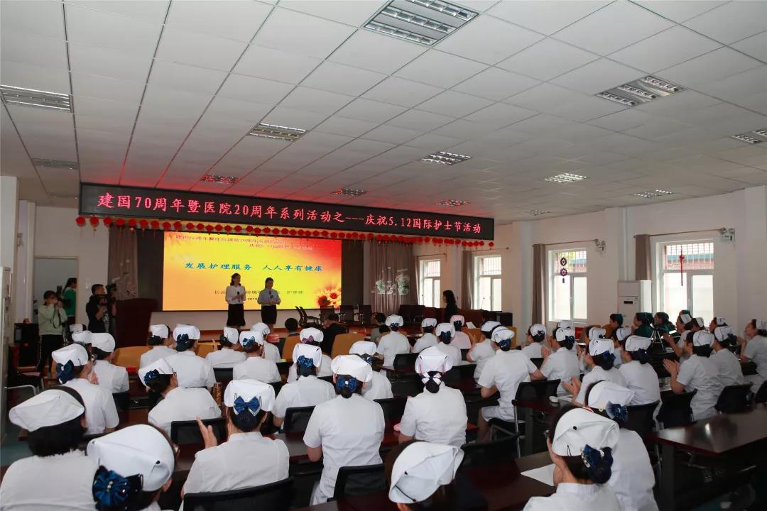 2019年是新中國(guó)成立70周年,我校附屬和濟(jì)醫(yī)院建院20周年。在這鮮花盛開、生機(jī)勃勃的美好季節(jié)里,迎來(lái)了第108個(gè)“5.12”國(guó)際護(hù)士節(jié)。5月9日下午,我校附屬和濟(jì)醫(yī)院在多功能會(huì)議室舉行了以“護(hù)士:引領(lǐng)之聲--人人享有健康”為主題的慶祝活動(dòng),主要有講述和濟(jì)故事、觀看視頻短片、表彰先進(jìn)。我校副校長(zhǎng)王金勝;和濟(jì)醫(yī)院黨委書記、院長(zhǎng)費(fèi)麗萍,紀(jì)委書記郭志宏,副院長(zhǎng)胡文慶,副院長(zhǎng)王培龍,副院長(zhǎng)(掛職)牛曉紅六位領(lǐng)導(dǎo)與全體護(hù)士長(zhǎng)、護(hù)士代表及部分職能科室人員,共200余人參加了活動(dòng)。