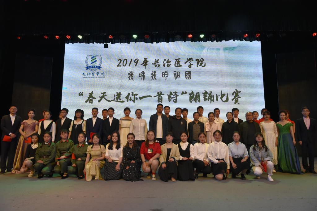 為紀(jì)念五四運(yùn)動(dòng)100周年,新中國(guó)成立70周年,營(yíng)造積極向上的校園文化氛圍,激發(fā)我校學(xué)生傳承中華優(yōu)秀傳統(tǒng)文化的歷史責(zé)任感和自豪感,5月11日晚6:00,由校團(tuán)委主辦、校學(xué)生會(huì)承辦的2019年長(zhǎng)治醫(yī)學(xué)院“我和我的祖國(guó)”——“春天送你一首詩(shī)”朗誦比賽在我??茖W(xué)會(huì)堂隆重舉行。各院系黨總支書(shū)記、各分團(tuán)委書(shū)記、各院系學(xué)生代表共計(jì)1000余人觀看此次詩(shī)會(huì)。