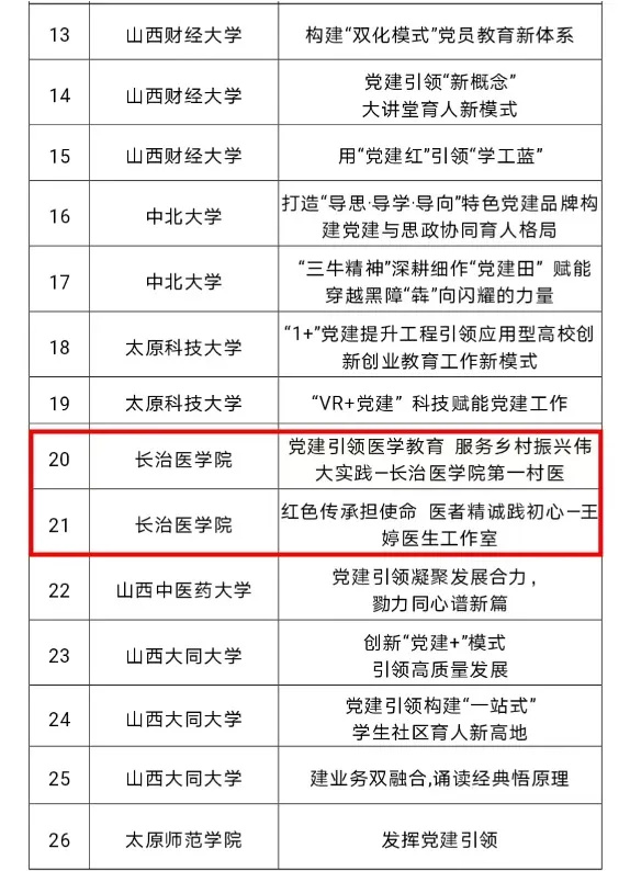 近日,中共山西省委教育工作委員會(huì)公布了2023年度教育系統(tǒng)黨建創(chuàng)新案例評(píng)選結(jié)果,我校推選的《黨建引領(lǐng)醫(yī)學(xué)教育 服務(wù)鄉(xiāng)村振興偉大實(shí)踐——長(zhǎng)治醫(yī)學(xué)院第一村醫(yī)》和《紅色傳承擔(dān)使命 醫(yī)者精誠(chéng)踐初心——王婷醫(yī)生工作室》兩個(gè)黨建案例成功入選2023年度教育系統(tǒng)黨建創(chuàng)新案例。