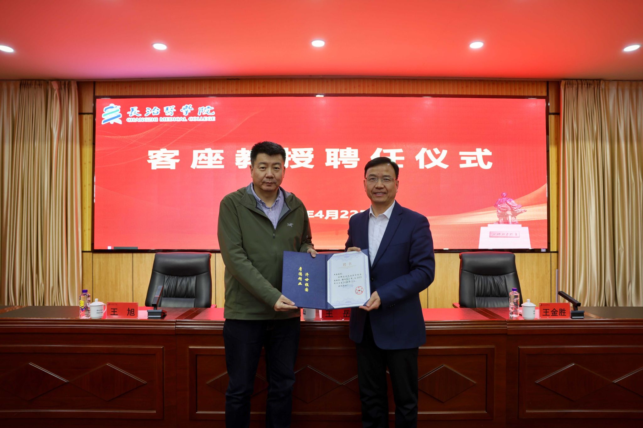 會(huì)前,校黨委書記王金勝為王岳教授頒發(fā)客座教授聘任證書。